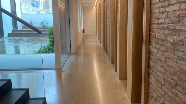 La luz penetra por las ventanas verticalidad de la construcción, dándole un aire de modernidad, que la tiene. La planta baja cuenta con una sala de reuniones, tres oficinas-despachos, una sala de coworking, una de reprografía y aseos.
